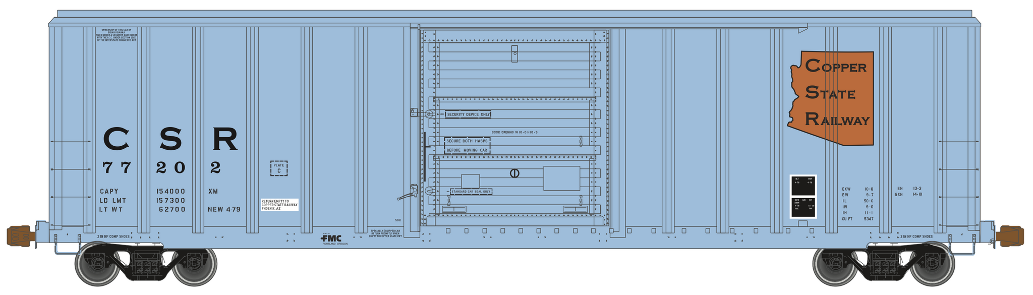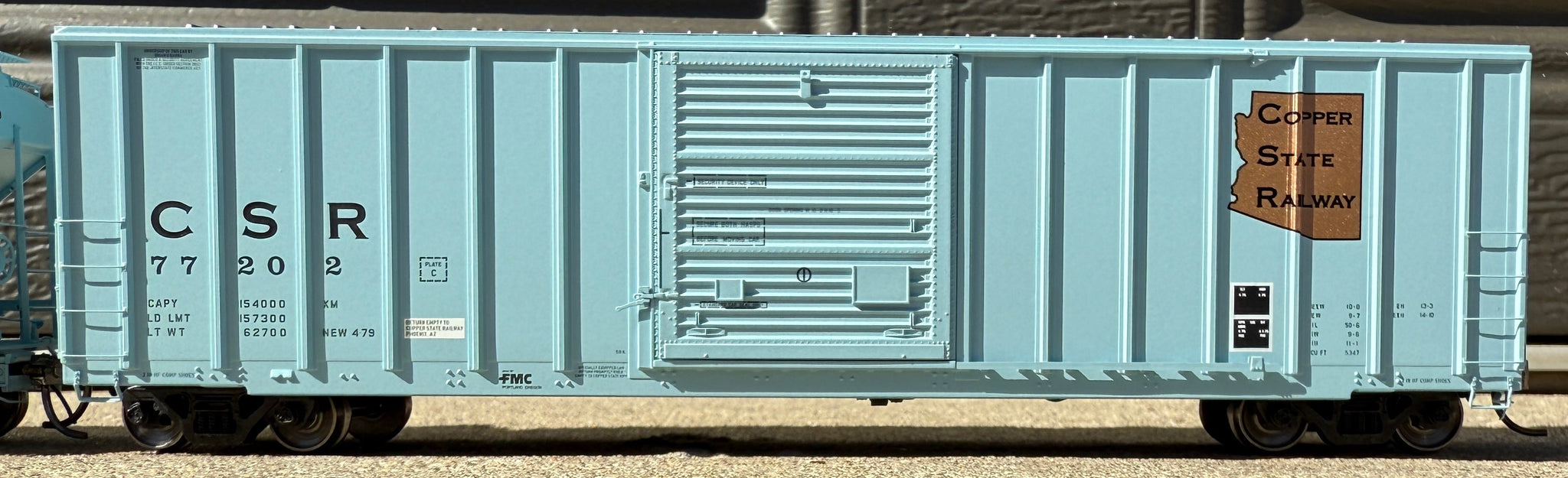 Whether spotted at a desert transload, rolling through red rock canyons, or rolling on a manifest across North America, the Copper State Railway FMC 5347 Box Car brings modern realism with regional identity to your railroad.